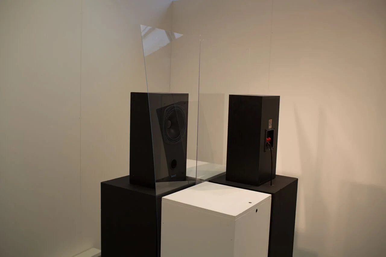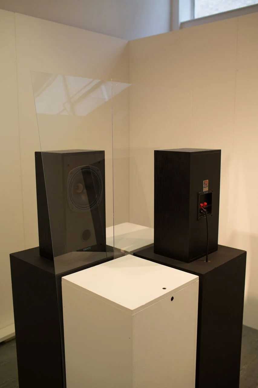 The installation by Nexcyia (Adam Dove) displayed in the foyer of the Carcere Duro (Hard Prison), on the third floor, engages viewer's perceptions of the divisions and hierarchies that manifest themselves between those in power and those considered to be without power. Inspired by the idea that fear generates a sound filter, which prevents us from recognizing our common humanity, this work embodies the present yet invisible fears symbolized by law enforcement. The distance between the driver, on the inside of the car door, and the law enforcement agent or "authority", on the outside, becomes a transparent yet indelible division, altering our interpretation of the sound on either side. Nexcyia's ongoing research draws heavily from personal and public vernacular archives and sound becomes a medium for the unsettling of fixed perspectives and positions, rendering both present yet intangible.
